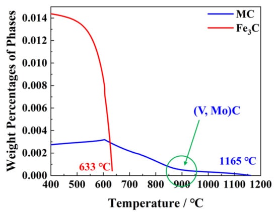 The content of both (V, Mo)C and cementite varying with temperature was calculated by Thermo-Calc with TCFE10.0 database (Figure 8). The completely dissolved temperature of cementite is 633 °C, while it is 1165 °C for (V, Mo)C precipitation. It was the addition of microalloying Ti that increased the completely dissolved temperature of (V, Mo)C precipitation. In actuality, the addition of Ti almost precipitates with N at high temperature so that V carbides mainly precipitate at about 900 °C, where the slope of the precipitation curve changes. Therefore, it could be deduced that the precipitation was mainly (V, Mo)C below 900 °C.