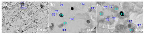 (V, Mo)C particles before and after being subjected to the SPA process are displayed in Figure 9. The results show that the (V, Mo)C precipitates are disclike; some of them are parallel to the martensite and RA length direction, showing the parallel orientation relationship. Once subjected to the SPA process, the particle morphology of (V, Mo)C changed from the disclike shape to a near-spherical shape, which relied on the different orientation relationship between (V, Mo)C and ferrite and austenite. Furthermore, the number density did not vary, indicating that the (V, Mo)C almost precipitated when tempered at 650 °C. The particles, marked by blue in Figure 9a, usually had large sizes due to the fast diffusivity at high temperature, so they provided limited strengthening contribution [27]. There are two types of (V, Mo)C particles after being subjected to the SPA process: Type 1, with bigger size precipitated during rolling and Type 2, with smaller size precipitated during the IT and SPA processes, named T1 and T2, respectively (Figure 9b,c).