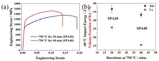 (a) Engineering stress and strain curves of SPA20 and SPA40; (b) relationship between −20 °C impact energy and volume fraction of RA.