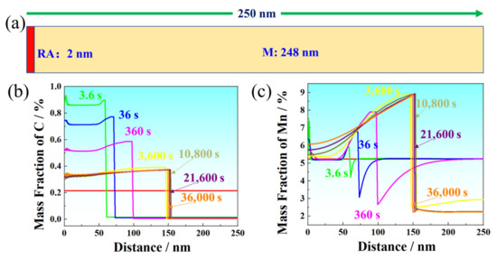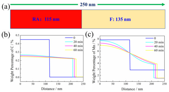 (a) Schematic diagram of the diffusion couple applied for DICTRA simulation of the SPA process. (b,c) Element concentration profiles of C and Mn near the γ/α interface, showing the moving γ/α interface.