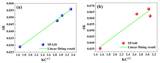 where D is the crystallite size, K is the magnitude of the diffraction vector, b is the magnitude of the Burgers vector, and ρ is the dislocation density, is the dislocation contrast factor, and M is a dimensionless constant. The dislocation density strongly depends on the slope of curves between ΔK and in Figure 13. Please refer to the literature for the detailed calculation steps [24,36,37]. The calculated dislocation densities of SPA20 and SPA40 are shown in Table 3.