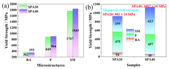 (a) Strengthening components of SPA20 and SPA40. (b) Strengthening contributions of SPA20 and SPA40 of the multiphase microstructures. F, RA, and SM represent ferrite, reversed austenite, and secondary martensite.