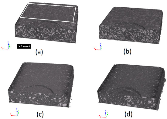 Although the SEM micrographs provide a morphology assessment of high accuracy, they required destructive preparation of the samples, and the area under analysis was restricted. Micro CT X-ray inspection is a valuable, non-destructive technique to obtain insight into the anisotropy of the fillers’ distribution and the granulometry of the incorporated fibers. The fillers are identifiable at the cross sections of the 3D reconstruction of the micro-CT scans (Figure 2). The non-uniformity of the olive pit particles’ distribution throughout the part thickness is evident in Figure 2c,d while the distribution of the rice husk fibers (Figure 2a,b) is more uniform. To quantitatively access the granulometry and fillers’ distribution through the thickness, three cross-section slices of the area, highlighted in the white box, in Figure 2a, were analyzed using the particle analysis module of the ImageJ software. The analyzed scans were designated further in the text as the top, bottom, and middle, where the top and bottom were at 0.2 mm from the part’s surface and the middle indicated its center (Figure 3).