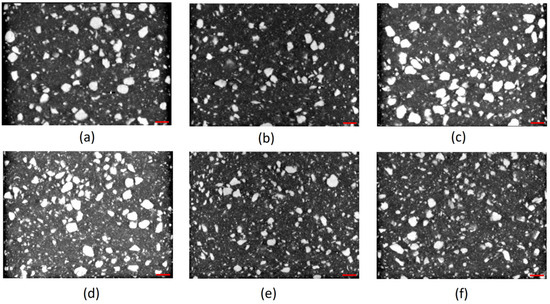 Micro CT scans of PP20%rh: (a) top, (b) middle, (c) bottom PP20%rh; and of PP30%rh: (d) top, (e) middle, (f) bottom, (red scale bar is equal to 1000 µm).