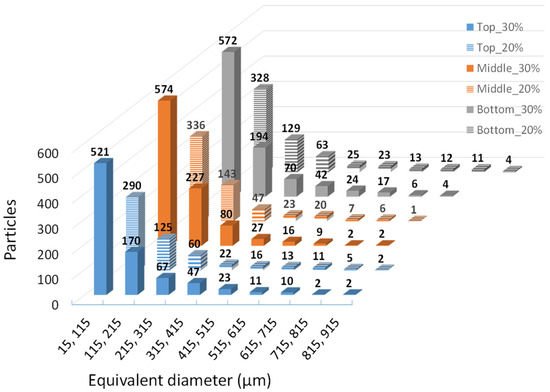 Histogram of the olive pit particle distributions at the top, middle, and bottom scan slices.