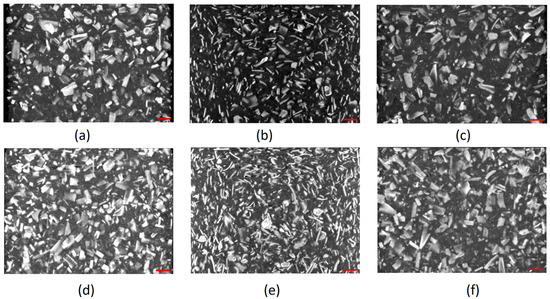 The SEM micrographs provided a morphology assessment of high accuracy; nevertheless, the area under analysis was limited. To identify the internal microstructure of the fiber-reinforced composites and uniformity of the fillers’ distribution along the length and throughout the thickness of this part, micro CT X-ray inspection was used for images acquired with 14 μm resolution. When exposed to X-ray radiation, the internal structure of a part absorbs it at different percentages, which is used to identify the fillers. This was accomplished by analyzing the fragments of the narrow section (13 × 3.2 × 15 mm) of the tensile specimens using a Bruker MicroCt Skyscan 1275 microscope (Bruker Corporation, Billerica, MA, USA). A sequence of projections was obtained and reconstructed using NRECON software v. 2.0 (Micro Photonics Inc., Allentown, PA, USA). CTAN v.1.18 software was used for the initial 2D/3D image analysis and processing (Bruker Corporation, Billerica, MA, USA). The quantitative data were treated with the open-source public domain software ImageJ 1.54h5 [35].