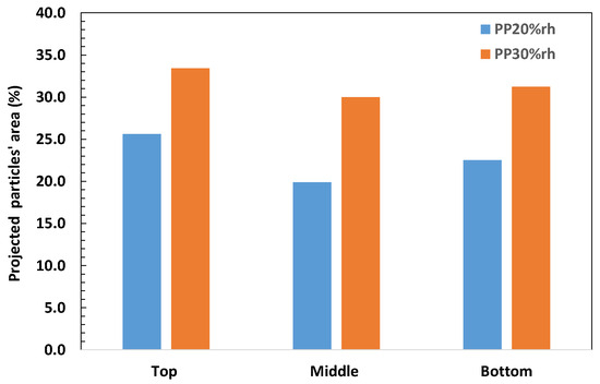 The rice husk fibers had higher surface-to-area volume ratios and a more irregular shape than the olive pit particles, as shown in Figure 6. Thus, their quantitative evaluation was limited to their relative orientation and assessment of the projected area in the different planes throughout the thickness (Figure 7). The rice husk fibers were aligned along the part wall, as shown in Figure 6a,c,d,f. The through-thickness projections of the rice husk fibers at the part surface were more extensive than in the middle (Figure 6 and Figure 7), where the fibers became more randomly oriented (Figure 6b,e) for both PP20%rh and PP30%rh. The alignment of the rice husk fibers along the part wall increased the tensile and flexural moduli (Table 6 and Table 7) and decreased the shrinkage of these composites (Table 4).