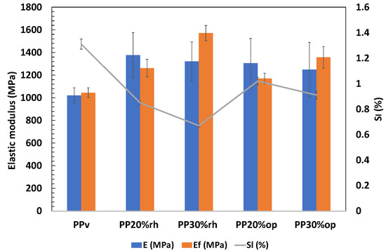 As shown in Table 6, the elastic modulus (E) increased in all the composites when compared to PPv, with PP20%rh showing the highest increase (35%) and PP30%op exhibiting a lesser improvement (22%). The lower performance of PPop may be attributed to the olive pit particles’ agglomeration and a large amount of the dispersed small-size particles (Figure 4), leading to a larger interface area of weak PP/filler interaction. Meanwhile, the rice husk fibers had higher surface-to-area volume ratios, which favored interlocking with the PP matrix.