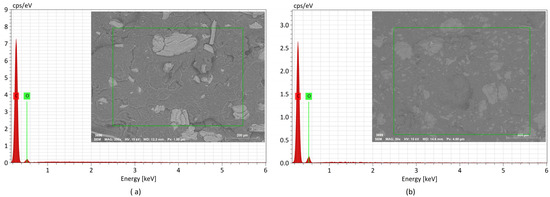 Considering that the primary molecular compounds of olive pits are mainly hydrogen, carbon, and oxygen, in the case of PPop (Figure 10), only carbon and oxygen were detected. As shown in Figure 9b and Figure 10b and Table 8, the amount of oxygen rose with an increase in the fiber load, proportionally to a decrease in the amount of carbon. The same observation was valid for silica, which more than doubled with the increased rice husk content, shown in Figure 9b.
