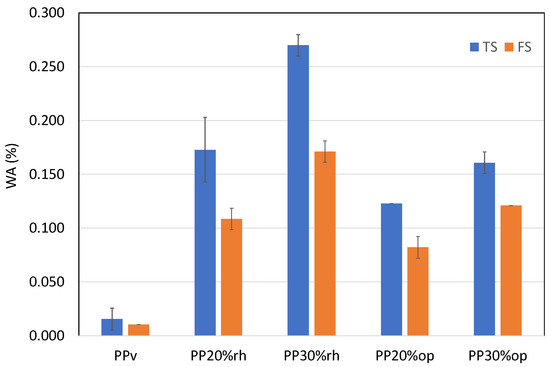 The greatest problem when using lignocellulosic filler in composite materials is its strong sensitivity to water, which is detrimental to their mechanical performance and durability [41]. To explore the potential applicability of the rice husk and olive pit PP-based composites for use in humid conditions, a 24 h immersion test was carried out, the results of which are shown in Table 9 and Figure 11. As was expected, the water absorption in PPv was less than 0.02% due to its intrinsic hydrophobicity. The inclusion of rice husk and olive pit in the PP matrix led to a significant increase in the water uptake, 0.27% for PPrh and 0.17% for PPop, the value increasing with the filler load independently of its type. It must be mentioned that the thicker specimens (FS) showed lower water absorption, as depicted in Figure 11, corroborating the data reported in earlier research [42] regarding to the short-term water immersion. For all the composites, higher water absorption occurred at higher filler loading due to the hydrophilic nature of the cellulosic fibers. The presence of hydroxyl (OH) groups between the macromolecules of the cellulose, hemicellulose, and lignin fiber cell walls promotes the interaction with the water molecules through hydrogen bond formation and reduces the interfacial adhesion between the fiber and the matrix [24,42,43,44,45].