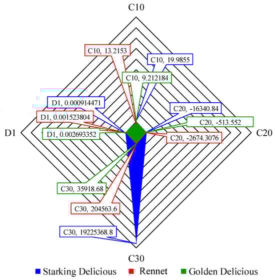 | Golden Delicious (This study) | 9.21 | −513.55 | 35,918.68 |