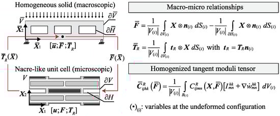 The volume of the homogenized nacre-like composite material is denoted by and it is enclosed by the surface on which the macroscopic first Piola–Kirchhoff traction vector acts . All the quantities reported in Figure 1 with the subscript (i) are referring to the undeformed configuration. The volume of the primitive unit cell (RUC) is identified as . The undeformed and deformed RVE configurations are associated with an infinitesimal neighborhood of a generic point which is related to the homogenized lightened nacre-like composite material subjected to a macroscopic gradient deformation . The position vectors are defined as and , with reference to the undeformed and the deformed RVE configuration, respectively. The microscopic gradient deformation tensor is defined as , while its determinant represents the Jacobean of the transformation, representing the volume change measure.