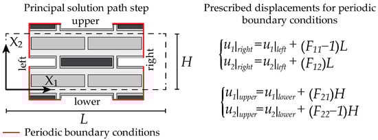 Firstly, the static response was investigated by solving the nonlinear boundary value problem formulated on an adequately chosen RVE, adopting the homogenization theory assumptions together with periodic boundary conditions, as reported in Figure 2. The finite deformed configuration was obtained by imposing the following macroscopic gradient deformation tensor: