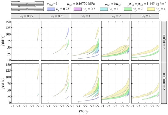 Generally speaking, the numerical outcomes highlighted that the complete bandgaps become wider for increasing values of the main volume fraction vf from 91% to 99%, while for vf < 91%, no bandgaps were found for all the investigated parameters. Additionally, our findings indicate that as the platelets aspect ratio wp increases, the frequency ranges of the complete bandgaps also increase. Simultaneously, these ranges become wider with higher values of the stiffness ratio k. Notably, the lowest stiffness ratio examined k = 1000 exhibited band gap structures characterized by extremely sparse and narrow bandgaps; consequently, for brevity, these results have not been included in the manuscript.