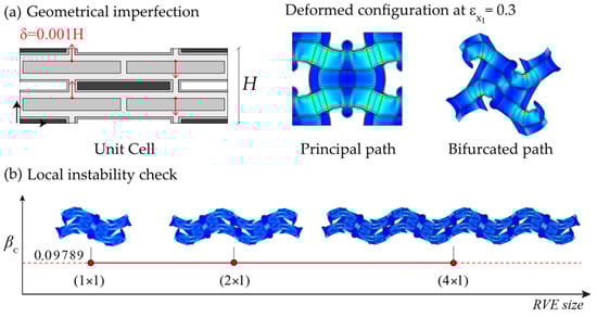 Deformed configuration of the metamaterial RVE for the principal solution path step together with the bifurcated one (a) and the results of the local instability check (b).