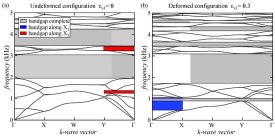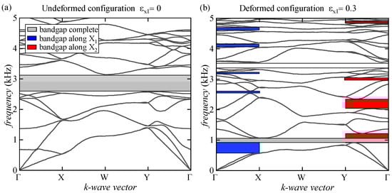 Dispersion relations for the lead-enhanced microstructure at the undeformed configuration (a) and at the bifurcated one (b) with a uniaxial stretch ratio along the X1 direction equal to 0.3.