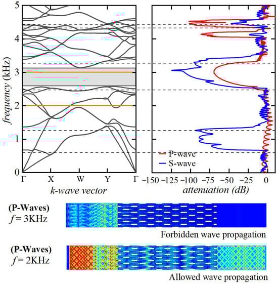 The results obtained through the Bloch wave analyses were also validated by the attenuation test performed by means of frequency-domain simulations in which, for a given exciting frequency, the displacement obtained in input (on the left boundary of the model) and in output (on the right boundary of the model) were compared to determine the attenuation intensity, as reported in Figure 7 (periodic boundary conditions were imposed on the top and bottom boundaries).
