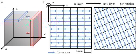 The L-PBF Ti6Al4V alloy was studied in both the as-received condition (AR) and after heat treatment (HT). In both conditions, specimens were examined in both XY and XZ orientations (Figure 1a). Specimens were obtained from dense 30 mm × 30 mm × 30 mm cubes, which were produced using an M280 EOS Direct Metal Laser Sintering system (EOS GmbH, Krailling, Germany) by Fundación Idonial (Gijón, Spain). The particle size of the powder feedstock varied in the range between 20 and 63 μm. The laser used had a power of 280 W and a spot size of 0.07 mm, scanning each layer with a thickness of 0.03 mm. The laser traveled in alternating scans along 5 mm stripes with a hatch spacing of 0.09 mm at a speed of 1200 mm/s, covering the entire printing area (Figure 1b). This pattern was rotated by 67° for each subsequent layer to minimize residual stresses.