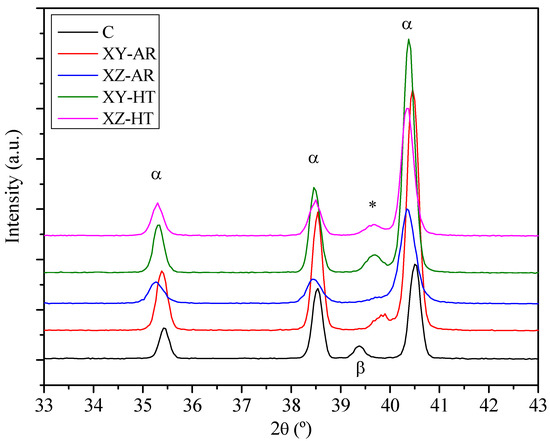 XRD diffractograms revealed that AR and HT conditions, for both XY and XZ orientations, (Figure 3) showed peaks corresponding to the martensitic α’ needles and/or α lamellas. The XY-AR and XZ-AR samples presented a shoulder near 40°, which was noticeably more pronounced in the XY-AR sample. The XY-HT and XZ-HT samples presented wide peaks nearer to 39.5°. These peaks can be assigned to the formation of a V-rich phase (marked as * in Figure 3), associated with the initial formation of small β aggregates at the α grain boundaries [20] even after a thermal treatment at 600 °C for 2 h [17]. Therefore, for the present investigation, it can be concluded that (i) traces of β aggregates within the grain boundaries of α’/α needles at the AR condition (650 °C for 3 h) were found and (ii) higher temperatures facilitated the diffusion of V toward the grain boundaries of α lamellas, leading to the growth of the β aggregates. In the following, this will be referred to as β*.