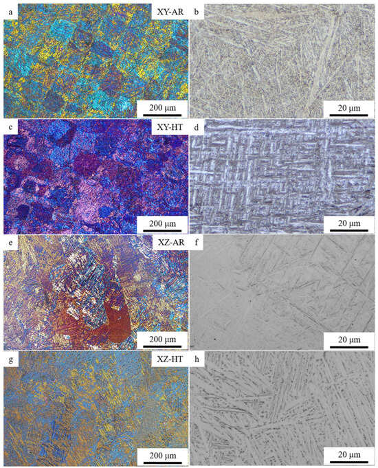 Figure 4 shows the optical micrographs of the XY-AR (a and b), XY-HT (c and d), XZ-AR (e and f), and XZ-HT (g and h) samples. Images in polarized light show that the XY-AR (Figure 4a) and XZ-AR (Figure 4e) samples presented the typical chessboard pattern and columnar structure, respectively, of L-PBF Ti6Al4V alloys. Such microstructures were distorted after the heat treatment (XY-HT Figure 4c and XZ-HT Figure 4g, respectively). Higher magnification images showed that the characteristic α’/α needles (Figure 4b,f) transformed after the heat treatment into thicker α lamellas (Figure 4d,h).