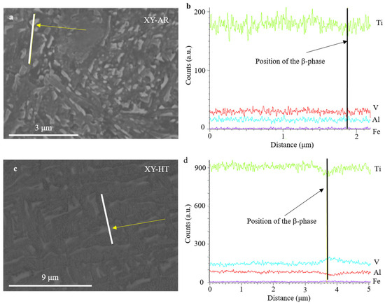 SEM images and EDS measurements in Figure 5 show the microstructural transformation after the heat treatment in better detail. The XY-AR (Figure 5a) and XZ-AR (Figure 5c) samples presented a fine microstructure with a darker phase, corresponding to the α’/α needles, and a brighter phase with a slightly higher content of V (spectrum 2 in Figure 5a and spectrum 1 in Figure 5c). After the heat treatment, both XY-HT and XZ-HT (Figure 5b and d, respectively) showed thicker α lamellas (darker phase in SEM images), as well as a larger brighter phase with higher content of V (spectrum 1 in Figure 5b and spectrum 1 in Figure 5d). Figure 6 shows EDS line scan measurements on the XY-AR (Figure 6a,b) and XY-HT (Figure 6c,d) samples. The line scans were taken along the darker α’/α phase and across brighter particles. In the case of the XY-AR sample, the line scan in Figure 6b did not show a significant variation of composition across the brighter particle. In contrast, for the XY-HT sample, Ti and Al contents decrease at the brighter particle, while the V line shows a peak.