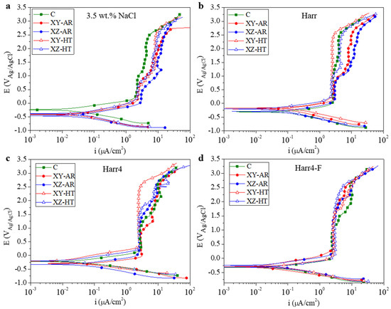 Potentiodynamic polarization curves in (a) 3.5 wt.% NaCl; (b) Harrison’s solution; (c) modified Harrison’s solution with a pH of 4; and (d) modified Harr4 with the addition of 0.12 mg/dm3 F− (Harr4-F).