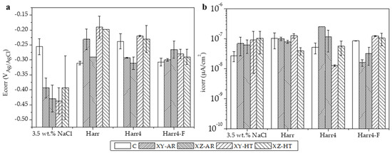 The Ecorr values showed distinct behavior in the 3.5 wt.% NaCl medium, with the C alloy being significantly nobler (Ecorr approximately −0.25 V) than the AM-ed alloys (−0.45–−0.4 V). In the unmodified Harrison’s solution (Harr pH 6.2–6.5), the C alloy became less noble and had a greater icorr in comparison with the 3.5 wt.% NaCl solution. On the other hand, the AM-ed alloys presented a higher Ecorr (>−0.3 V) than the C alloy while having similar icorr. Under acidic conditions in the Harr4 solution, the C, XY-HT, and XZ-HT samples presented similar Ecorr (−0.25–−0.2 V) and icorr values, while the XY-AR and XZ-AR presented lower Ecorr and higher icorr. Finally, in the harsher Harr4-F solution, all the specimens presented similar Ecorr values (−0.3–−0.25 V). In terms of icorr, the XY-AR and XZ-AR samples presented the lowest currents while the C, XY-HT, and XZ-HT samples showed similar values.