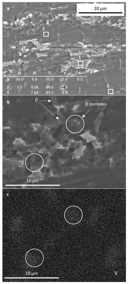 SEM images of the C sample after 1 h immersion in Harr solution polarized at 2.15 V. (a) overview of the sample surface showing the corrosion of all the phases; (b) high magnification image of corroded β phase; (c) V element EDS map of the region shown in (b).