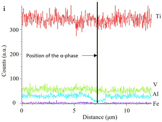 Figure 10 presents SEM images of the XY-AR (a and b), XZ-AR (c and d), XY-HT (e and f), and XZ-HT (g and h) samples after the polarization in Harr solution. The XY-AR and XZ-AR samples showed a general dissolution of the martensitic α’ matrix and were accompanied by slight protrusion of the β* aggregates and the formation of a thick oxide film. Regarding the XY-HT and XZ-HT samples, α lamellas were preferentially dissolved, and β* aggregates protruded from the surface. However, preferential dissolution of α lamellas was more severe in XZ-HT, with localized corroded regions (Figure 10h). Figure 10i represents the EDS composition profiles taken along the line scan shown in Figure 10h. It can be seen that at the location of the α phase, the concentration of Al decreased drastically. This correlated with the findings in the anodic region in Figure 7b, where XZ-HT presented a second passive segment, while XY-HT had a single passive segment at lower currents.