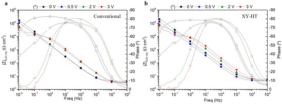 Electrical characteristics of the specimens at different voltages (0 V, 0.5 V, 2 V, and 3 V) were considered in order to underpin the degradation mechanism. Figure 11 illustrates Bode plots for conventional (a) and AMXY-HT (b) alloys at the mentioned polarization potentials. Both alloys present similar values in the total impedance modulus measured at the minimum frequency (|Z|0.01 Hz), being that the parameter is known to provide an estimation of the overall corrosion resistance. In addition, both alloys show the same tendency on the |Z|0.01 Hz, with the applied voltage characterized by a decrease in the total impedance down to the range between 5 × 104 and 7 × 104 Ω·cm2 at higher voltages. The impedance response also reveals the presence of different relaxation processes. The passive layer is responsible for the high-frequency relaxation process (103 Hz), whereas the middle/low-frequency response of the system (101–102 Hz) can be attributed to the electrochemical activities of the substrate. Regarding the phase angle frequency plots (represented with open symbols), both materials indicate a capacitive behavior at 0 V that changes to a more complex response for higher voltages.