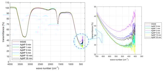 The IR spectrum of the CWSAE-synthesized AgNP without UV radiation appears similar to that of the CWSAE; the two spectral lines are nearly identical except for the valley near 500 cm−1. The spectral valley near 500 cm−1 draws particular interest. The significant difference in the peak transmission between the WSAE-only and AgNP without UV radiation cases (~29% vs. 33%) indicates that the reduction process responsible for AgNP formation involves dynamics in the frequency range of 500 cm−1 (15 THz). This frequency range is associated with photo absorption by large molecules [21,22]. In the present case, it is likely that the dynamics of the secondary structure of the protein play an important role in the formation of AgNP.