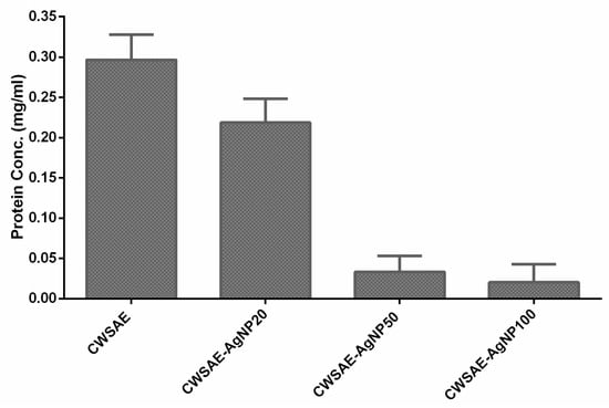 Bicinchoninic acid (PierceTM BCA Protein Assay Kit) analysis was also performed for CWSAE-induced AgNPs. Each 300 µL of CWSAE, with a protein concentration of 0.297 mg/mL, was mixed with 50 µL of AgNO3 at various concentrations (20 mM, 50 mM, 100 mM) to create mixtures designated as CWSAE-AgNP20 for the 20 mM group, CWSAE-AgNP50 for the 50 mM group, and CWSAE-AgNP100 for the 100 mM group. The CWSAE-AgNO3 mixtures were then incubated at room temperature (20 °C) for ~30 h. Subsequently, the formed AgNPs were isolated by centrifugation for 30 min at 14,000 rpm, using the Labnet Spectrafuge 16M Benchtop Micro-Centrifuge (Edison, NJ, USA). Bicinchoninic acid (BCA) assays were performed, with three repetitions for each, to measure the protein concentration in CWSAE samples after the isolation of the AgNPs.