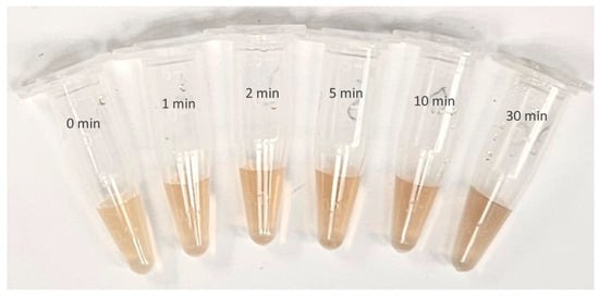 Thus, the observed alterations in the maximum peak wavelength and absorbance of the UV-Vis spectra of the AgNPs could be attributed to their increased aggregation induced by UV radiation. As mentioned above, Mittelman et al. [18] report aggregation by UV radiation and decrease in the magnitude of the zeta potential by UV radiation. The aggregation of AgNPs is believed to result from protein–protein interactions among the protein-based capping agents on the surface of biologically reduced AgNPs (Figure A4). However, in the groups subjected to longer UV treatment times (10 min and 30 min), we observed a greater amount of precipitated, aggregated AgNPs.