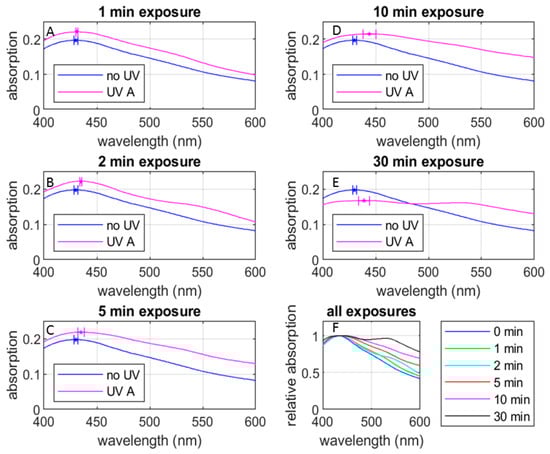 UV-Vis absorption spectra under various UV exposure durations compared with the non UV-exposed case: (A) 1 min UV exposure, (B) 2 min UV exposure, (C) 5 min UV exposure, (D) 10 min UV exposure, (E) 30 min UV exposure, and (F) relative absorption-spectra for all UV exposures. The spectral lines are from the data with 4-week-stored AgNP samples while the error bars are from the combination of 4-week-stored and 20-week-stored AgNP samples. See below for the definitions of the 4-week- and 20-week-stored samples.
