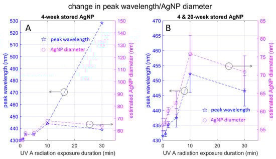Change in UV spectrum peak wavelength and AgNP diameter with UV radiation: Plots in (A) depict data from 4-week-stored samples, highlighting the data point corresponding to the red-side peak observed in the 30-min exposed sample. Plots in (B) show a combination of 4-week- and 20-week-stored samples, with error bars. These plots elucidate the reduction in particle size observed during radiation, specifically from 10 min to 30 min.