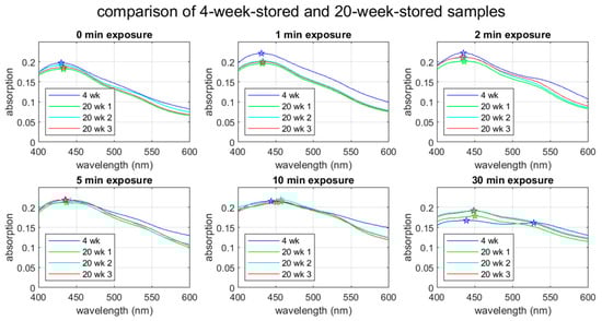 UV-Vis spectra for 4-week- and 20-week-stored samples. In the 4-week-stored case, the spectra were obtained within 48 h after the UV treatment, whereas spectra were obtained within one hour after the UV treatment for the 20-week samples. The star symbols indicate the peak wavelengths.