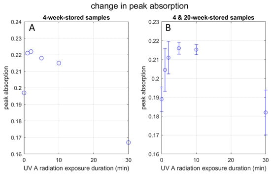 Change in UV peak absorbance with UV radiation: (A) graph shows the peak absorption pattern of the 4-week-stored AgNP samples at UVA radiation exposure time points in minutes; (B) graph shows the peak absorption pattern in combination with the 4-week-stored AgNP samples and the 20-week-stored AgNP samples together at UVA radiation exposure time points in minutes, with error bars.