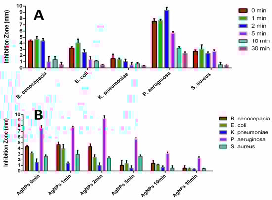 Inhibition zone graphs of UV-treated AgNPs against five bacteria: (A) Inhibition Zone data of different UV-Exposure time grouped by the same tested bacteria: The inhibition Zones become larger at the short UV-Exposure time (1 min and 2 min, compared to 0 min as a control group) and smaller at the long UV-Exposure times (5 min, 10 min, and 30 min) and (B) Inhibition Zone data of different bacteria data grouped by the same UV-Exposure time: For P. aeruginosa, AgNPs 2 min, AgNPs 10 min, and AgNPs 30 min groups show relatively higher inhibition zones than the ones of the other bacteria. For S. aureus, AgNPs 5 min groups show relatively higher inhibition zones than the ones of the other bacteria except P. aeruginosa. (The inhibition zones were measured as the diameter of the inhibition zone in millimeters minus 6 millimeters (the diameter of the disk)).