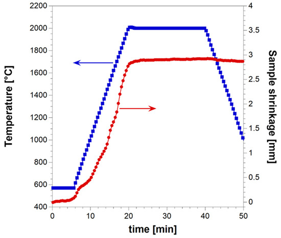 Temporal profiles of temperature (blue curve) and sample shrinkage (red curve) recorded during the preparation of dense HEB_Nb–SiC by reactive SPS (TD = 2000 °C, HR = 100 °C/min, tD = 20 min, P = 20 MPa).