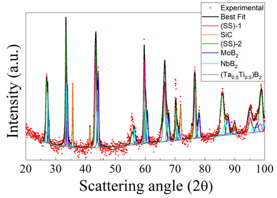 The X-ray diffraction pattern, experimental and the best fit, of the R-SPSed product is reported in Figure 2. The corresponding structural and microstructural parameters estimated by the Rietveld analysis are summarized in Supplementary Table S1. The resulting sample is characterized by a mixture of phases which consist, according to the performed Rietveld analysis (Rwp = 9.6%), of two solid solutions of (Hf0.2Ta0.2Nb0.2Mo0.2Ti0.2)B2, with slightly different cell parameters, and SiC, while also displaying other binary and individual diborides, namely, (Ta0.5Ti0.5)B2, MoB2, and NbB2. The total amount of undesired secondary phases resulted to be above 40 wt.% (Table S1), so that the obtainment by reactive SPS of the desired HEB–SiC product was far from being achieved.