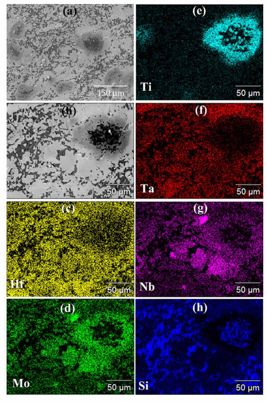 General (a) and detailed (b) SEM views along with the corresponding Hf (c), Mo (d), Ti (e), Ta (f), Nb (g), and Si (h) EDS maps of the HEB_Nb–SiC sample obtained by R-SPS (TD = 2000 °C, HR = 100 °C/min, tD = 20 min, P = 20 MPa) according to Reaction (1) with Me = Nb.