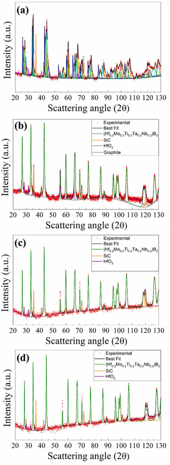 XRD patterns and related Rietveld refinement of (a) HEB_Nb–SiC powders obtained by SHS (Rwp = 9.8%) and corresponding bulk samples obtained at different SPS conditions (20 MPa, HR = 200 °C/min): (b) 1800 °C/20 min (Rwp = 7.6%), (c) 1900 °C/5 min (Rwp = 8.4%), and (d) 1900 °C/20 min (Rwp = 9.8%). (a) Experimental: red dots; Best Fit: dark solid line; (Hf0.2Mo0.2Ti0.2Ta0.2Nb0.2)B2: olivine solid line; TaB2: brown solid line; NbB2: pale blue solid line; SiC: orange solid line; MoSi2: magenta solid line; MoB2: blue solid line; (MoTiB4)0.5: violet solid line; TiB2: yellow solid line; HfB2: Prussian blue solid line; SiO2: aqua green; C (Graphite): grey solid line; Si: dark yellow solid line; B4C: light green solid line.