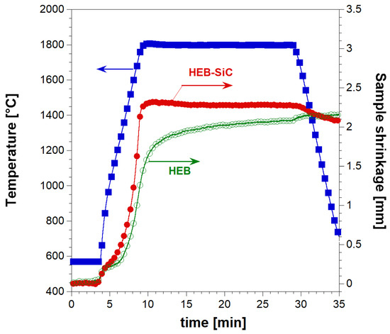 Comparison of sample shrinkage recorded during the preparation of dense HEB_Nb by SHS–SPS in the presence of (red curve) or without (green curve) SiC (TD = 1800 °C, HR = 200 °C/min, tD = 20 min, P = 20 MPa). The corresponding temperature profile (blue curve) is also shown.