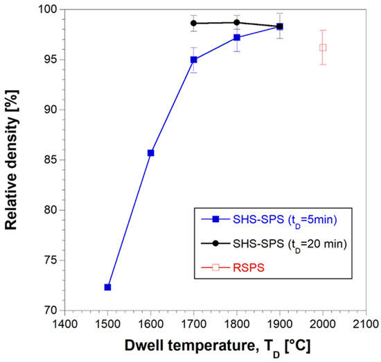 The effect of the dwell temperature on product density is reported in Figure 6 for two holding time values (5 and 20 min). The extremely low densification level achieved at 1500 °C/5 min (72.3%) was progressively improved up to 98.3% as the sintering temperature was increased to 1900 °C. Similar relative densities were also achieved at lower temperatures (1700 °C), when the holding time was prolonged to 20 min. In the latter case, a further increase in TD to 1800 and 1900 °C did not determine additional beneficial effects, at least from the sample densification viewpoint.