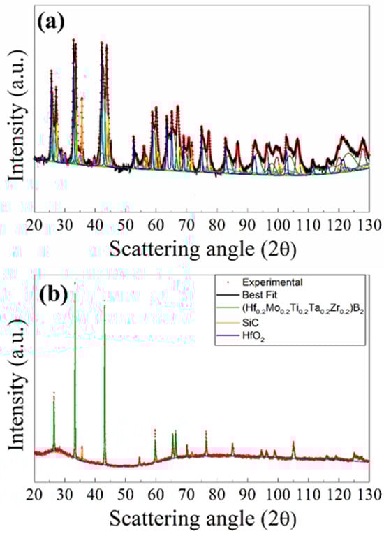 However, as shown in Figure 9b, the complete conversion of the secondary phases into the desired ceramic composite was attained during SPS. Specifically, as evidenced by the Rietveld analysis (Supplementary Table S4), the sintered sample basically consisted of (Hf0.2Mo0.2Ti0.2Ta0.2Zr0.2)B2 (84.4 wt.%) and SiC (14.1 wt.%), with only a small amount of HfO2 (1.5 wt.%). As for the case of the HEB_Nb system, it was also confirmed that no silicide phases were found in the sintered samples, the initial Si precursor being finally converted into the corresponding carbide. The lattice parameter values of the HEB_Zr phase, i.e., a = 3.0976 Å and c = 3.3628 Å (Table S4), obtained by the Rietveld refinement, were in line with the literature data reported for the same system [34].