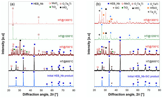 XRD patterns of HEB_Nb (a) and HEB_Nb–SiC (b) samples after being heat treated in an air furnace at different temperatures. Apart from HEB and SiC, the other crystalline phases identified by XRD analysis in the oxidized samples and the related COD [35] cards are MoO3 (1,538,963), O7Ta2Ti (4,343,510), O4TaTi (2,002,580), HfO2 (1,528,988), TiO2 (9,004,144), Ta2O5 (2,102,123), HfSiO4 (9,000,852), and SiC (1,011,031).