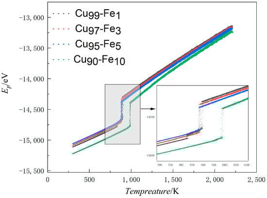 During the simulation process, as the system’s temperature decreases, the intensity of the thermal motion of atoms in the system also decreases. The gradual decrease in speed facilitates the combination of atoms, leading them to combine with each other, thus forming ordered structures. The formation of this ordered structure results in a decrease in system volume. When the volume of the system decreases to a certain point, the local cluster structure formed in the alloy will rapidly disintegrate in order to minimise the energy of the system. The atoms will then recombine into a more stable structure, leading to crystallization. This process is accompanied by a sudden decrease in the system’s energy. Manifested as a sudden change in the average atomic potential temperature curve. At Fe content levels of 1%, 3%, 5%, and 10%, the APE-Temp change lines exhibited temperatures of 894 K, 887 K, 887 K, and 994 K, respectively, indicating the formation of crystals in the system. The APE-Temp variation line suggests that as the Fe content in the alloy increased, the average atomic potential energy decreased, resulting in a more stable system structure.
