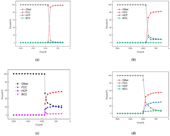 Crystal type ratio versus alloy temperature change curve. (a) Cu99Fe1, (b) Cu97Fe3, (c) Cu95Fe5, (d) Cu90Fe10.