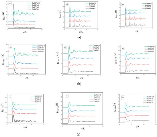 The radial distribution function, expressed as g(r), is a statistical parameter reflecting the distribution characteristics of system atoms and represents the ratio of the probability of finding an atom β at a fixed atomic distance α from radius r to the conditional probability [25,26,27]. The radial distribution function serves as a valuable tool for distinguishing between liquid, crystalline, and amorphous states in a material. It offers structural insights, including atomic radius, inter-atomic spacing, and coordination number. Through the analysis of peaks in the radial distribution function curve, the strength of inter-atomic interactions can be assessed, and the extent of short- and mid-range ordering in the material’s atomic arrangement can be determined [28,29]. The radial distribution functions of Cu99Fe1, Cu97Fe3, Cu95Fe5, and Cu90Fe10 alloys were calculated at 2000 K–300 K with a cooling rate of 2 × 1010 K/s, and the results are shown in Figure 3.