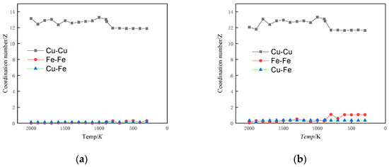 When the alloy contained 1% Fe, the coordination numbers of Fe-Fe and Cu-Fe atoms remained relatively constant as the temperature decreased. However, once the temperature reached the phase change point, the coordination number of Cu-Cu atoms suddenly decreased. This indicates that the atomic arrangement became denser and the alloy underwent crystallisation. At this point, the crystal structure of Cu dominated the alloy, and Fe clusters did not form. When the alloy contained 3% Fe and reached the phase transition temperature, the coordination number of Fe-Fe atoms increased. This signifies that Fe-Fe atoms tend to aggregate at this specific temperature and composition. However, the coordination number of Cu-Fe atoms notably remained largely unchanged during this phase transition. Given the phenomenon that the proportion of BCC crystal structure was basically unchanged with the decrease in temperature in Figure 2b, an observation can be made that when the Fe content was 3%, although the Fe-Fe atoms had the tendency to aggregate with each other, the Cu atoms accounted for a larger proportion of the Fe atoms. Moreover, the clusters formed by Fe atom aggregation were solidly dissolved in the Cu matrix of the FCC crystal structure, and the structure of the alloy was still dominated by the Cu crystal structure, which is the reason for the basically unchanged coordination number of the Cu-Fe atoms. This is also the reason why the Cu-Fe atomic coordination number was basically unchanged [36]. When the Fe content was between 5% and 10%, the trends of Fe-Fe, Cu-Fe, and Cu-Cu atomic coordination numbers with temperature change were essentially the same, and the change was more obvious for the Fe content of 10% than that of 5%. When the temperature of the alloy reached the phase transition temperature, the coordination number of Cu-Cu atom pairs suddenly decreased, and crystals were formed. Before reaching the phase transition temperature, the coordination number of Fe-Fe atoms steadily increased as the temperature decreased. In contrast, the coordination number of Cu-Fe atoms decreased gradually before the phase transition temperature. These trends suggest that in the liquid state, Cu-Fe atoms were dispersed, while Fe-Fe atoms began to exhibit increasing attraction and aggregation. This process continued until the phase transition temperature was reached. After the phase transition temperature, the coordination numbers of these atoms remained relatively stable, indicating a distinct change in the state of the alloy.